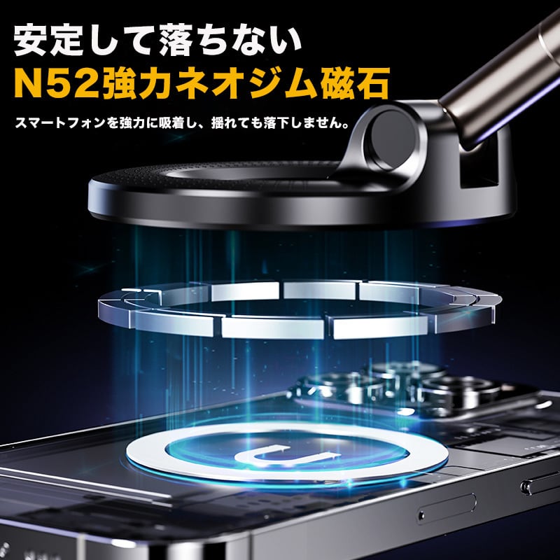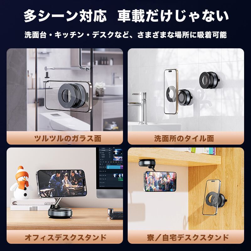 2025 【ベーシック版】強力吸着真空吸盤式スマホホルダー、車載・家庭・オフィス・アウトドア自撮り用スマホスタンド、360度調整可能、折りたたみ式、高品質合金材質、高い安定性、多数のiPhoneおよびAndroid機種に対応。